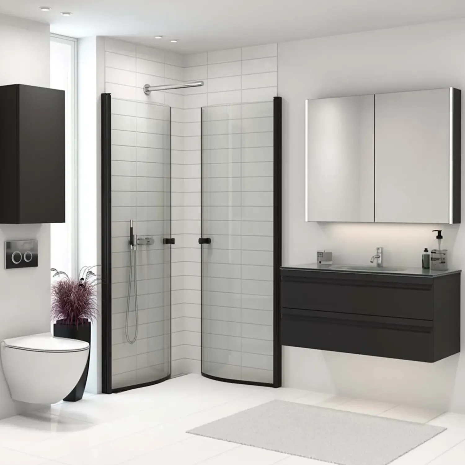 Den store buet dør sikrer nem adgang og kan samtidig lukkes ind mod væg, så afskærmningen ikke optager plads i rummet. Med de slanke profiler og store enkle glasflader kun afbrudt af et minimalistisk greb er dette den mest diskrete bruseløsning.