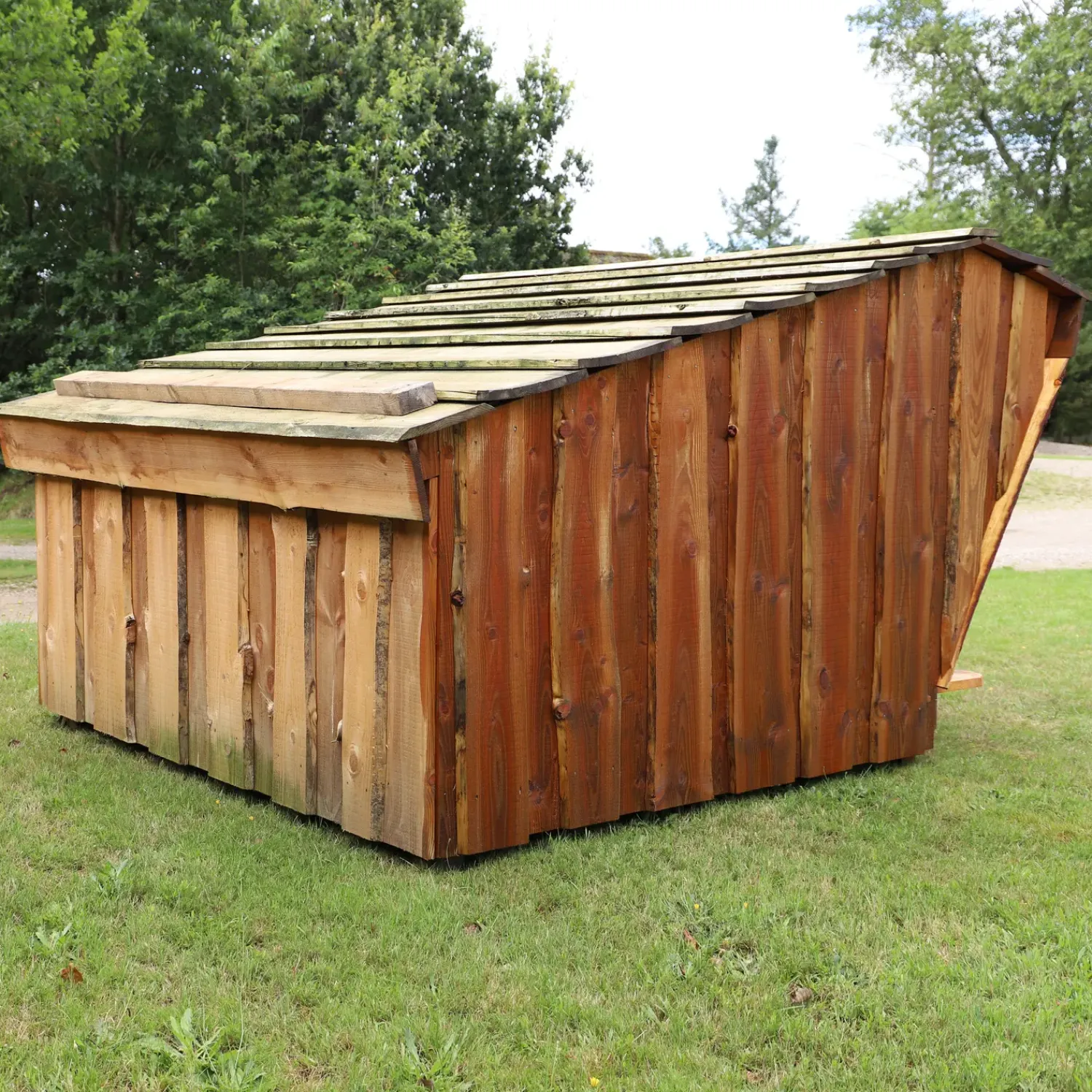 Shelteret er fremstillet af robuste materialer, så som gulv i vandfast krydsfiner og tag i rå kalmarbrædder. Kalmarbrædderne kommer i naturligt format.