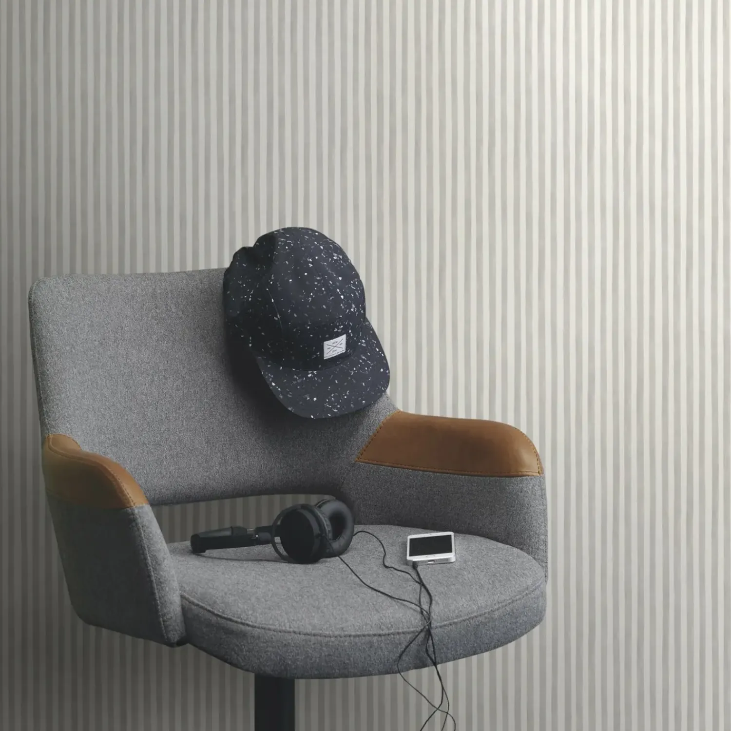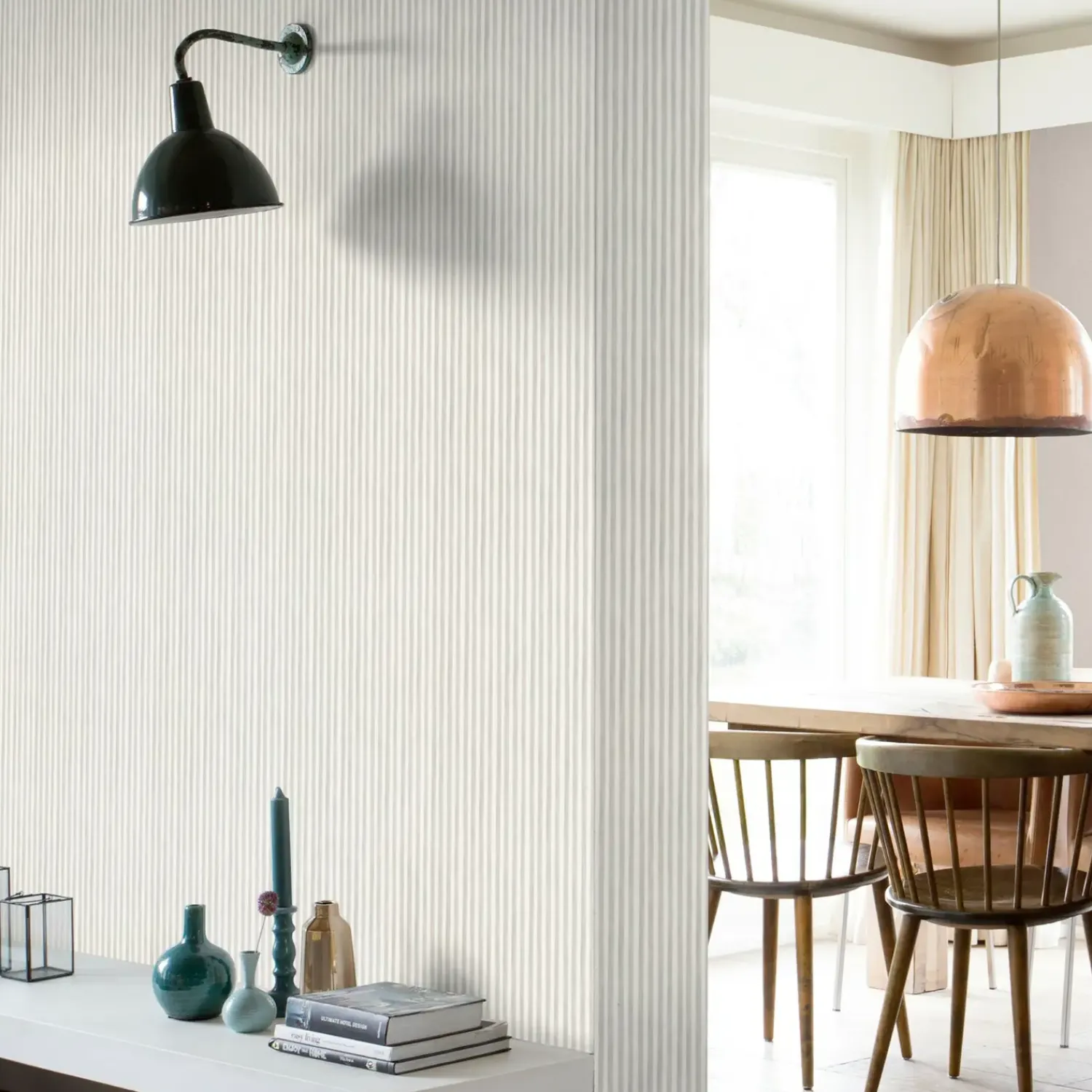 Et stribet tapet med brede striber, der giver enkle, nordiske og behagelige nuancer, der kan passe til både en traditionel og moderne indretning. Perfekt til både børneværelset, gangen, stuen og soveværelset. Skab en badehotelsstemning med tapetet.