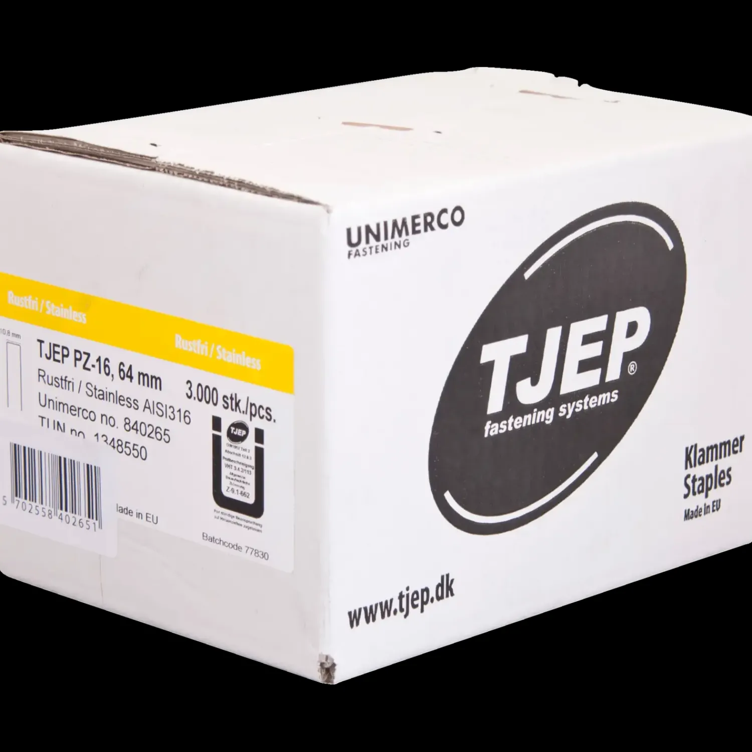 Tjep PZ-16 klammer med lim til klammepistolOverflade: Rustfri A4Længde: 64 mmBredde: 10,8 mmTykkelse: 1,6 x 1,4 mmAn…