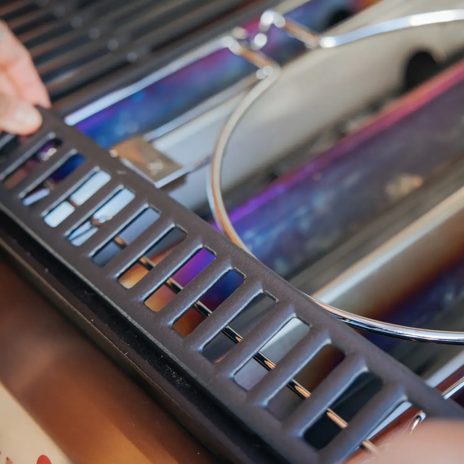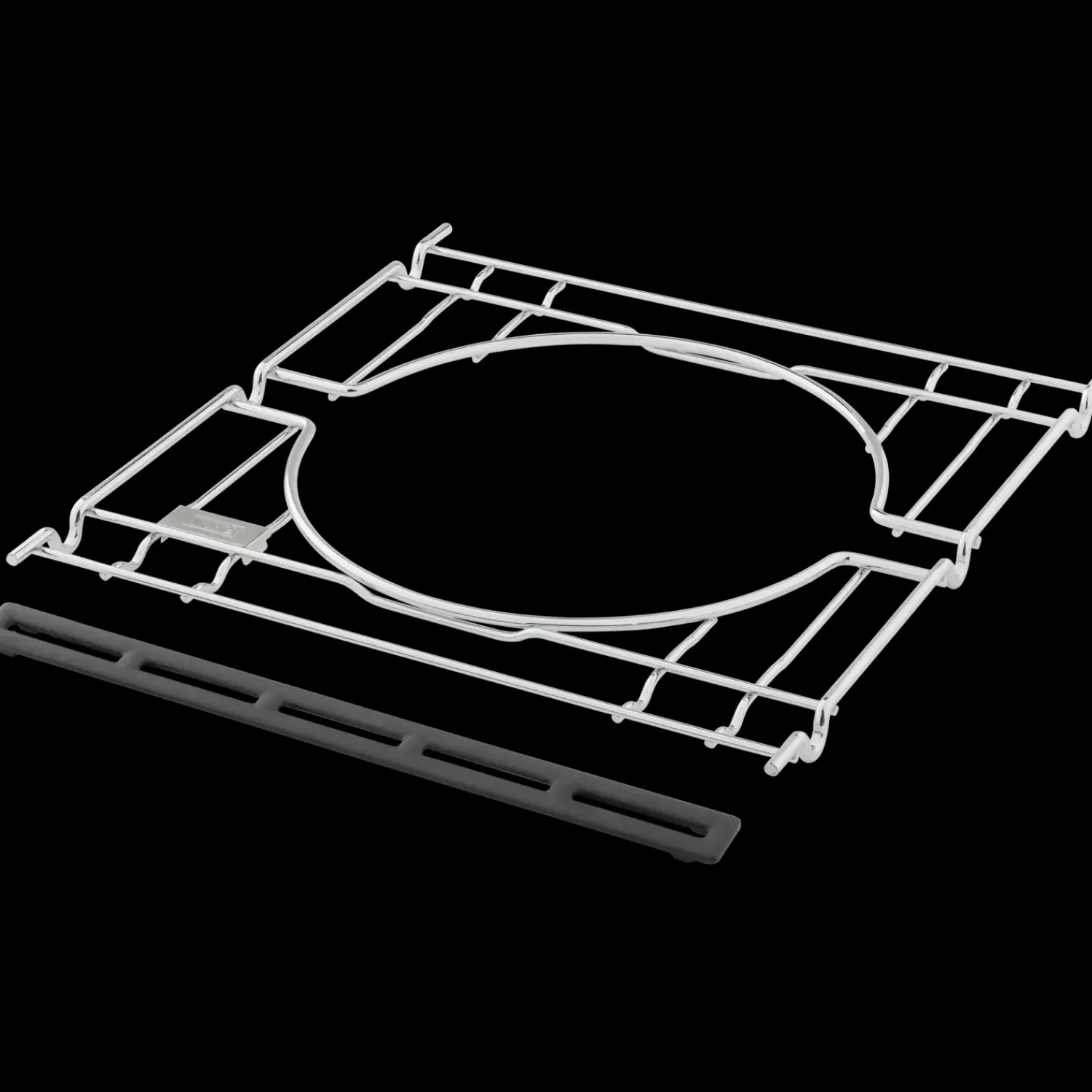 Rammesættet er belagt med stål og afstandsstykket af porcelænsemaljeret støbejern. Efter brug kan du roligt komme rammen i opvaskemaskinen. Når sættet ikke er i brug, placeres det under højre grillrist.