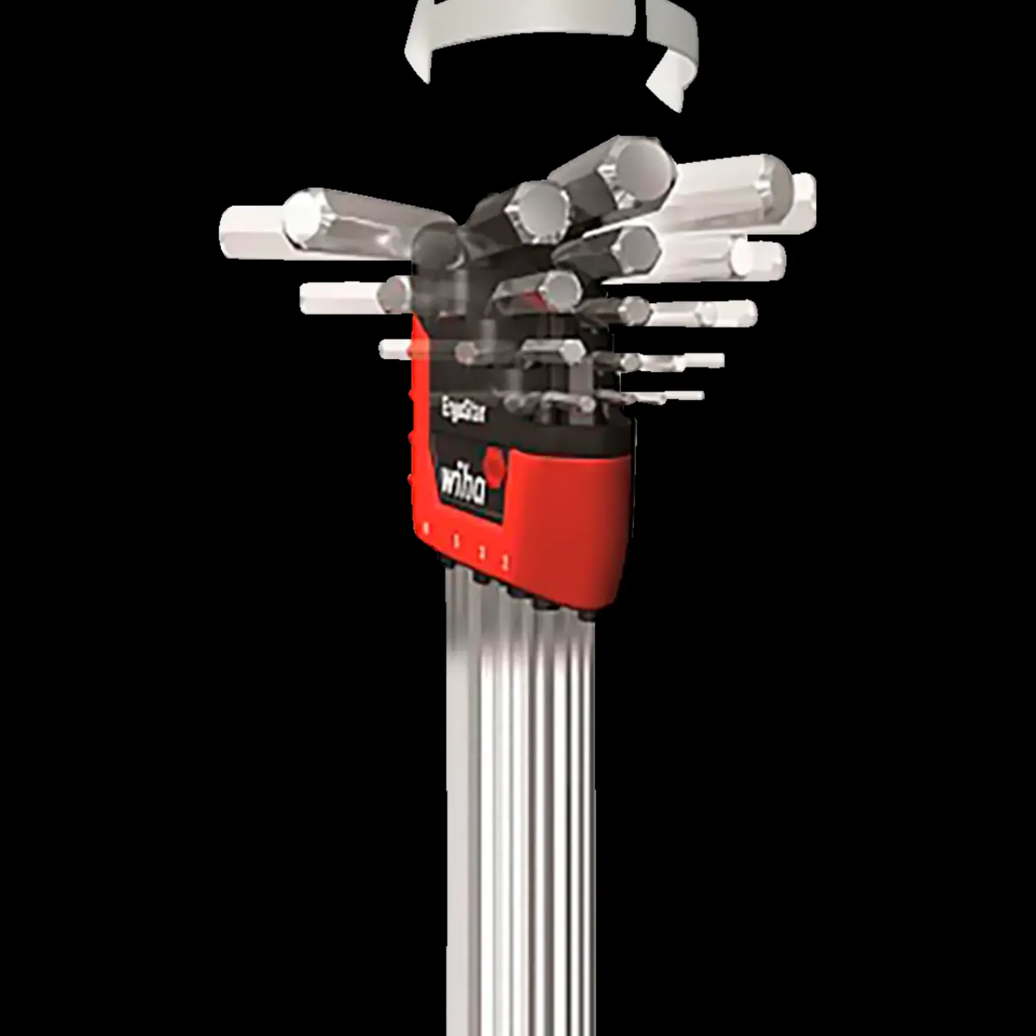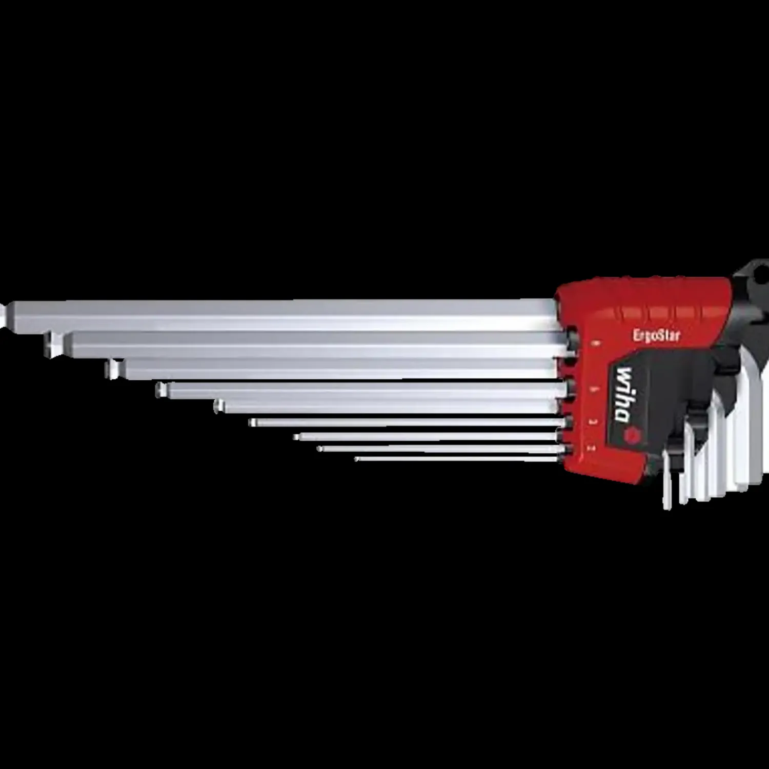 9 stiftnøgler med kuglehoved i praktisk Ergostar holder.